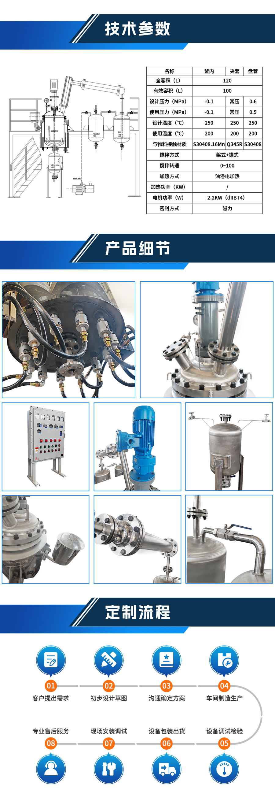 如果用戶(hù)在釜蓋、釜體開(kāi)口、內(nèi)部結(jié)構(gòu)、壓力高低、攪拌槳葉、及增加其他輔助裝置(如冷凝回流裝置、冷凝器、恒壓加料罐、接收裝置)等有特殊要求,可完全按用戶(hù)的要求加工制造 |