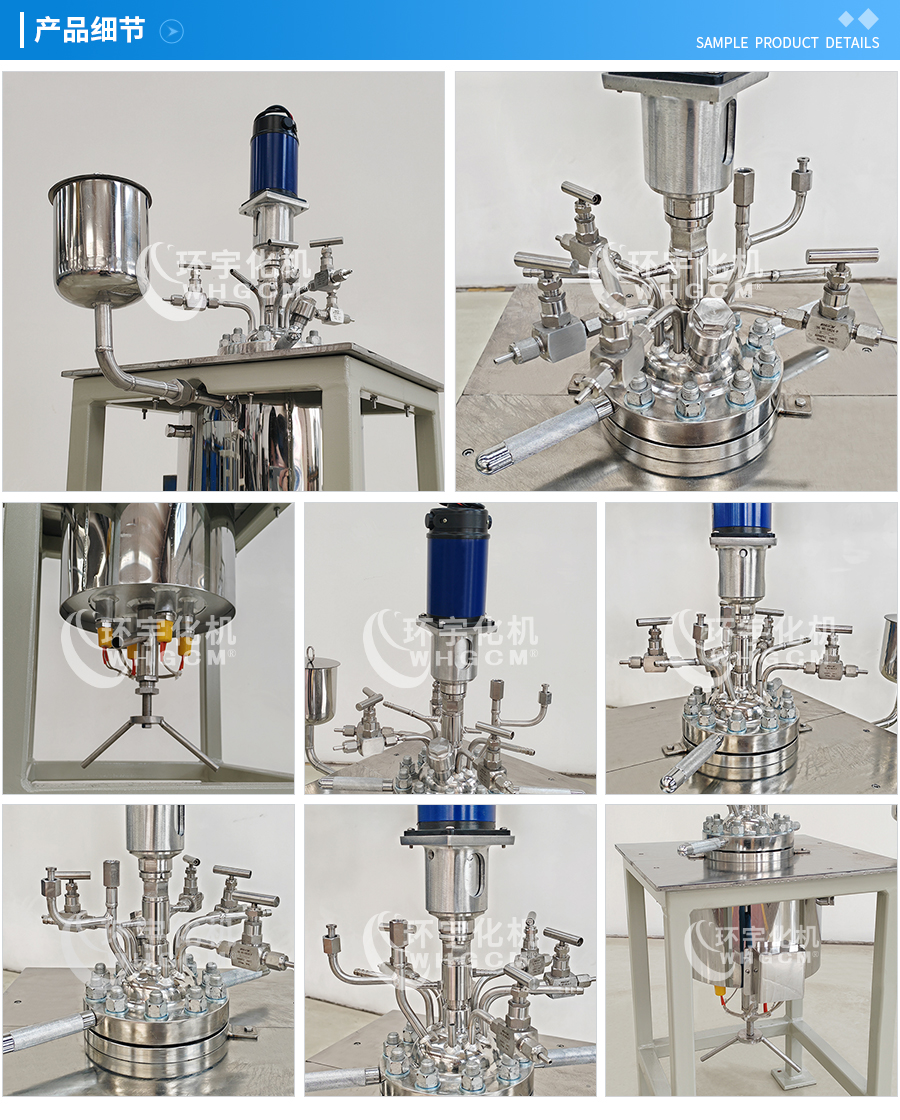 常規(guī)釜蓋開口 氣相口配針形閥,液相口配針形閥及釜內插底管,固體加料口配絲堵,測控溫口配鉑電阻,壓力表安全爆破口配壓力表及安全防爆裝置,釜內冷卻盤管進、出口配水咀